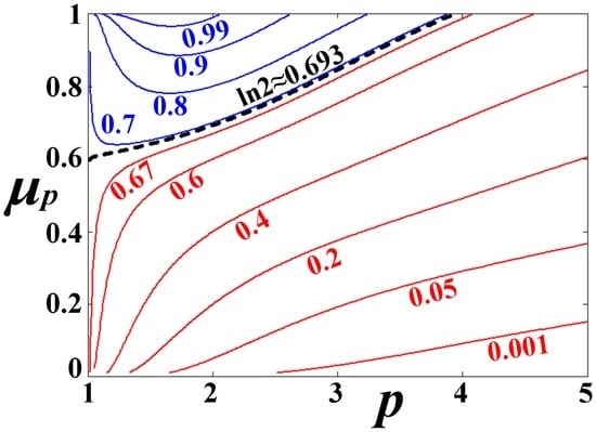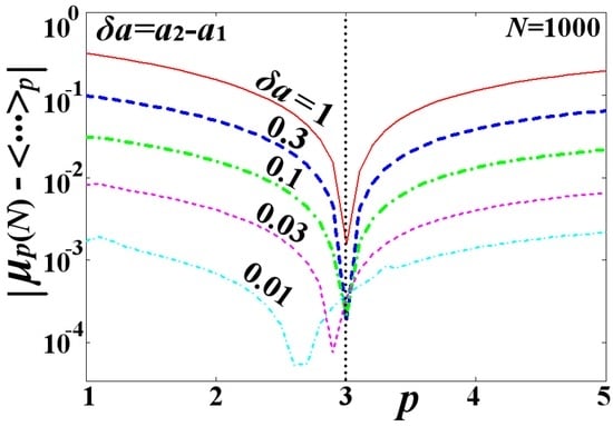 Figure 4 plots the deviation between the -mean estimator and the mean , that is, , and for a large number of data (). The mean is taken for the norm , while the deviation is plotted as a function of the norm p of the estimator. We observe that the deviation is minimized, tending to zero, when the norm is . However, this result holds if the distribution is not symmetric. Once the parameter decreases approaching zero, the distribution becomes symmetric and the deviation obtains small values (while its minimization at a certain p loses its meaning). We observe that for or smaller, the deviation is small enough—of the order of (it is non-zero because of the computation errors caused by the finite N), so that .