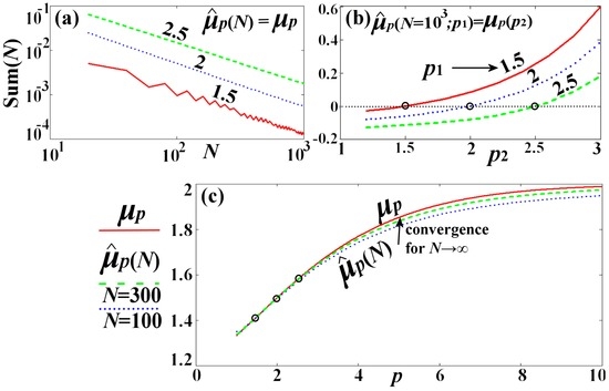 Figure 3 illustrates the convergence . Panel (a) plots the sum as a function of N and for the norms , 2, and ; we find a convergence rate of . Panel (b) plots the summation for large N, which becomes zero only if the p-norm used by the estimator , that is , equals the p-norm used by the mean , that is . Finally, panel (c) plots the value of the estimator , as a function of the norm p, for two data numbers and , showing the convergence to , which is co-plotted as a function of p.