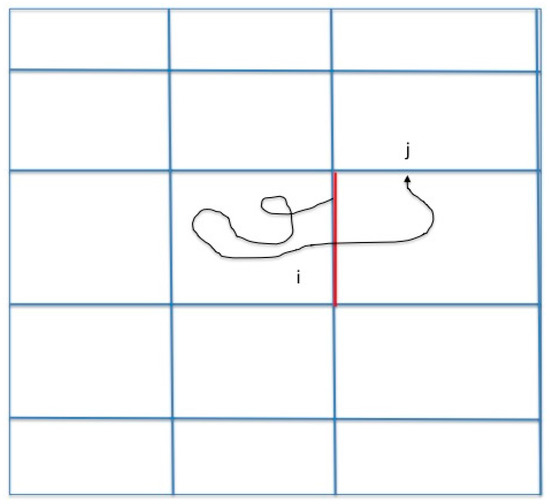 A schematic drawing of a Milestoning trajectory. We initiate trajectories at milestone according to a known flux distribution function at the interface: . We terminate the trajectories when they hit for the first time a different milestone (). An example of a single trajectory is displayed. The pathway starts from the red milestone and terminates at a divider . From multiple trajectories we estimate the matrix , which is the probability that a path initiated at milestone will terminate at milestone , where is the number of trajectories initiated at milestone and the number of trajectories initiated at that terminated at . Note that .