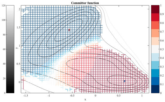 In Figure 2 we display the two-dimensional energy landscape of the first example [36,37]. The potential contour lines are in different level of gray (left bar) and the iso-committor values are in colors (right bar). We build a detailed two-dimensional grid in which every edge of a square is a milestone. We did not build a fine mesh at high-energy domains that are unlikely to be visited during the simulations and make a significant contribution to the kinetics. This choice explains the white area that are not covered by fine milestones at the top right and lower left corners. More specifically we consider set of points such that where A is a selected area to avoid very high energy domains. We have and . The length of every edge (a milestone) is 0.05. The total number of milestones is 8,320. The reactant is defined by the milestones surrounding the energy minimum at . The product is at the energy minimum (−0.623, 0.028). We consider dynamics described by overdamped Langevin and equations of motion