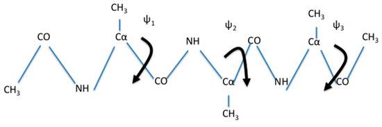 A schematic drawing of a blocked trialanine. We also show the three dihedral angles that are considered for the coarse variables: and . They are shown as rotations around bonds. In the simulations it turns out that has a restricted distribution (see also Figure 4) and therefore was not considered as a coarse variable in the calculation described below.
