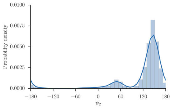 A natural choice for coarse variables to describe backbone transitions in peptide chains are the , and dihedral angles. The torsions of the peptide chain show significantly less flexibility and are not included. We also observed that is locked most of the simulation time in a single minimum (Figure 4). Therefore, we did not choose it as a coarse variable.