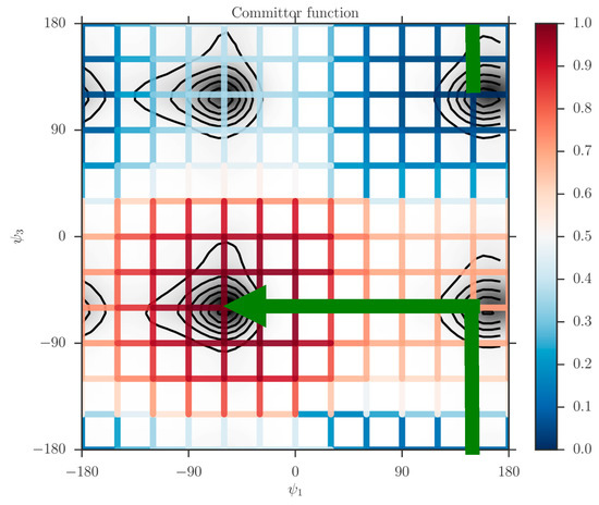 The committor function, colored-coded according to the bar on the right, is determined on a square grid and shown on the canonical probability density of two coarse variables of tri-alanine. The green arrowed line is a schematic reaction coordinate to guide the eye. It starts at the reactant and follows a steepest descent direction in committor space to the product. The iso-committor surfaces are determined in the space of coarse variables and are therefore approximate. See text for more details.