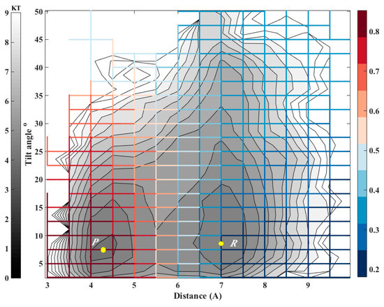 For each dihedral angle, we define 12 milestones covering the range between −180 to 180 degrees. The program Miles analyzed the trajectory [41,42]. Miles is available at http://clsb.ices.utexas.edu/web/miles and is a tool that runs and analyzes Milestoning simulations using other MD software packages such as NAMD [38]. Figure 5 shows the canonical probability density of this system as a function of the two dihedral angles and the grid used in the Milestoning calculations. The reactant is the free energy minimum at the top right corner of the figure , and the product is at the lower left . The value of the computed committor is color-coded according to the bar on the right.