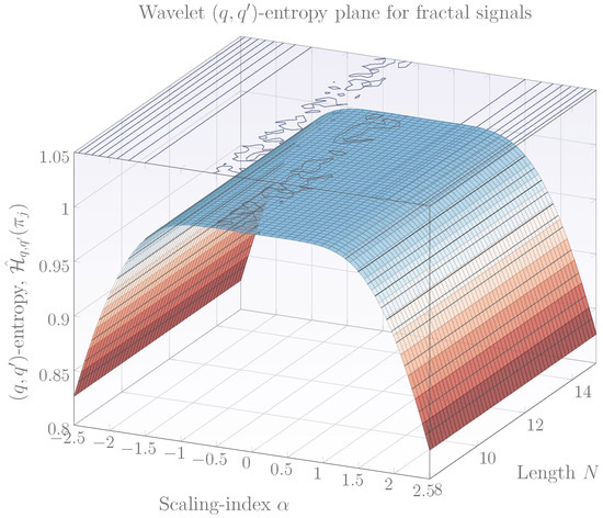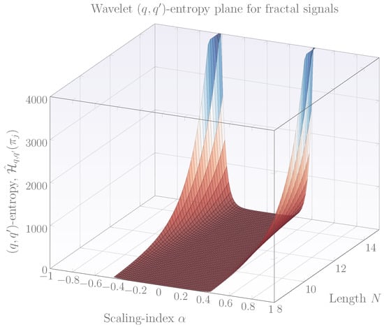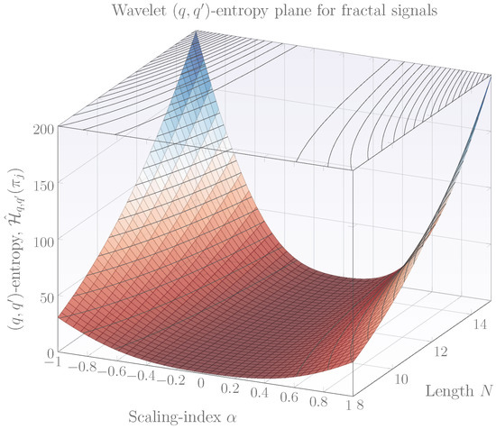 Equation (11) is of particular importance since it allows to construct the so-called entropy planes which permit to visualize the behavior of entropies for different q, , N and . A diversity of entropy planes can be obtained, however, they can be grouped into the following types for the case of fractal signal classification. Figure 1 shows an entropy plane constructed by setting the parameter , , using several N and . Note from the figure that in the limit of , entropies are small and appear to be zero, however their true value is: