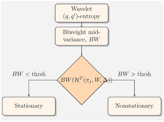 where , c is typically 9, MAD is the usual median absolute deviation and is the number of points which satisfy the condition. Wavelet -entropy therefore fluctuates for nonstationary processes and remains constant for stationary ones. The estimation of entropies by sliding windows permits to emphasize further the fluctuations and these fluctuations can be quantified with the biweight midvariance. In theory, wavelet -entropies for stationary processes are constant, however, in practice, they also fluctuate and a threshold is set in order to classify fractal processes. Based on this, Figure 5 presents the proposed scheme for classifying fractal signals as stationary or nonstationary using wavelet -entropies.