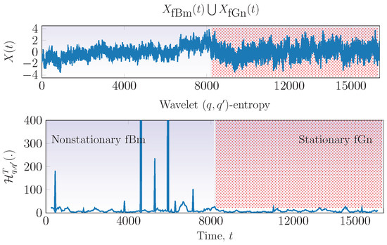 Classification of signals as stationary or nonstationary. Top plot: concatenated nonstationary and stationary signal, first half part is a nonstationary signal (fractional Brownian motion (fBm) with ) and second half corresponds to a stationary one (fractional Gaussian noise (fGn) with ). Bottom plot: wavelet -entropy of concatenated signal computed in sliding windows with , and .