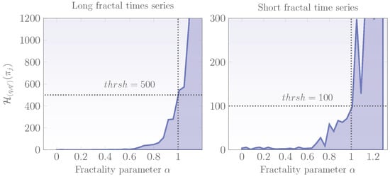 where . Note that in (8) for represents a probability mass function (pmf) in the sense that , and therefore many information theory quantifiers can be obtained for fractal signals using this relation. The application of (8) into the definition of -entropy [50] and given by the relation,
