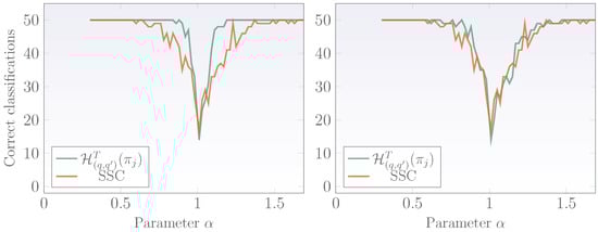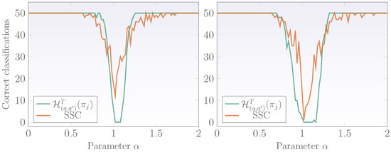 As previously mentioned, SSC is a well-known technique for classifying fractal signals as stationary or nonstationary. SSC refines the estimation of PSD in the limit of and within this limit it applies the bdSWV to enhance the estimations. In this interval, SSC basically converts a fGn signal into a fBm and an fBm into an extended fBm via a cumulative sum. The next step in the SSC algorithm is to obtain an estimate of H (). When , the signal is regarded as stationary and when it is nonstationary. For further details on the SSC and some comparison with the PSD technique refer to the work of Eke [13]. In the following, a comparison study of the SSC and the proposed technique based on wavelet -entropies is presented. To perform this comparison, exact fractal signals with known fractality parameters are synthesized. The method employed to generate these fractal signals is known as the Davies and Harte (DHM) technique and the algorithm is detailed further in [51]. The R package fractal includes the DHM and is used to synthesize fGn, fBm and PPL signals with length and , in the range of the fractality parameter and in steps of . For each , 50 fractal signals are generated and classified using the SSC and the methodology based on wavelet -entropies. Finally, the number of correct classifications against the fractality parameter is plotted and the accuracy of each methodology compared. The idea behind the use of PPL signals and the family of fGn/fBm signals stems from the fact that PPL signals represent fractal signals with exact power-law behavior while the fGn/fBm family are approximately fractal. Figure 8 displays the results of both techniques (SSC and wavelet -entropies) using signals of fGn/fBm type. In this experimental study, wavelet -entropy values were set with , , and the threshold with for long signals and for short ones. Left plot corresponds to long signals () while the plot on the right corresponds to short-length fGn/fBm signals (). For long and short signals, the methodology based on wavelets tends to have a lower range of misclassifications but has a weaker behavior when the fractality parameter approaches the limit.