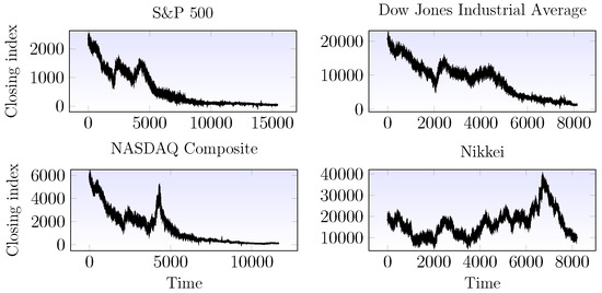 Stock market closing indices. Top left plot displays the S&P index from January 1956 to 21 April 2017. Top right plot displays the Dow Jones Industrial Average time series from February 1985 to 21 April 2017. Finally bottom left and right plots display the indices for the NASDAQ and Nikkei indices.