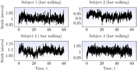 Many physiological and biomedical time series are modeled by fractal time series. Gait time series (gait dynamics) are example physiological signals for which fractal models have been applied [54]. In the following, the classification of stride interval (gait dynamics) time series using wavelet -entropy is performed. For the classification, the parameters are set to , , and . The time series consist of stride intervals of four young and healthy subjects walking fast during an hour-long interval. The time series are plotted in Figure 11. The biweight midvariances are and for the si01, si02, si03 and si04 subjects and clearly indicate that these time series are stationary.