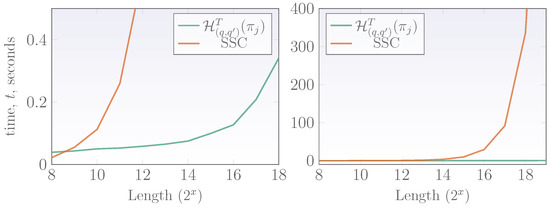 Average times for obtaining a classification using the proposed technique based on wavelet -entropies and the SSC. Left plot displays a comparison between these techniques while the plot on the right shows the classification times of SSC.