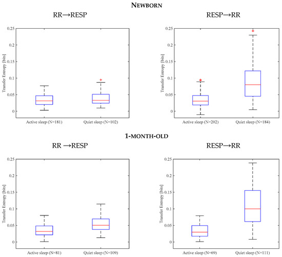 Boxplot of TE values. In the first row are shown values for newborn infants in active and quiet sleep with directionality RR → RESP on the left and RESP → RR on the right. In the second row, the same information is presented for 1-month-old infants.