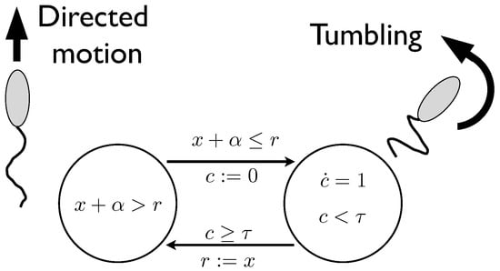 A bacterial chemotaxis controller described as a hybrid automaton, realised in practice by e.g., Escherichia coli species, but also as an engineering design for a molecular robot, using DNA-based components by Hagiya et al. [], from which the figure, slightly modified, is taken. Note that and are internal set-points, which constitute pattern-information embodied in the molecular robot’s structure and are ultimately determined by Darwinian evolution (natural robots) or intentional design (human artefacts). The bacterium responds to the environmental concentration (e.g., of glucose); its objective function x, which is detected by a membrane transducer which generates the internal variable r. It is searching for a higher concentration when x is below a set threshold (directed motion) and tumbles randomly for a time set internally by using an internal “clock” signal c, whenever the concentration is at least equal to the threshold. The swimming and tumbling are modes of action of its flagella. The objective function of this system is the experienced concentration x and the goal is . The chemotaxis controller exhibits will-nestedness of one.