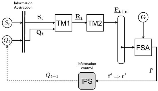 TM2 uses these hypothetical responses to compute the set of possible futures at a time (n may take any positive value) for which in a simple case is a map of responses onto possible futures (simple, because there is not necessarily a relation between and , but we need not be concerned with that at present). There is no limit on the number of possible futures that TM2 may compute, but it must be at least 2 for a choice to exist. These possible futures are each represented by a set of states , each member being equivalent to a prediction of a possible . The finite state automaton FSA chooses from among these, using a selection criterion based on the objective function defined by a goal G, which is generated by the agent (not exogenously). This goal is the maximisation of the master function, (e.g., for a living agent this is life-time reproductive success). The goal enables the optimal possible future state to be recognised (it is the one which maximises the master function) and this future state implies an optimal response (in general there could be more than one, in which case the agent will be indifferent among them). Having selected an optimal response, the agent then must implement it in the physical realm. Since the computation of has been conducted in the realm of information, this step appears to involve the control of material by information. In practice all the computation and indeed all the information is instantiated by material and energy acting in the physical realm, so our cybernetic model is merely an abstract representation of the organisation of the physical processes which lead to the implementation in the physical system and this return to physical reality is represent by the action (IPS). Such implementation inevitably results in a transformation of the agent into a new state , together with and this restarts the cycle. It may be noted that Von Neumann’s self-replicating automata are proven universal Turing machines [] and Turing machines are thought to be common among living systems, so this computational arrangement is not beyond the bounds of possibility.