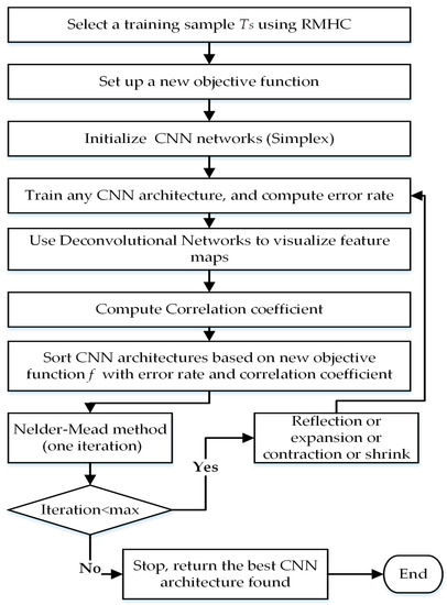 where is a correlation coefficient parameter measuring the importance of and The key reason to subtract from one is to minimize both terms of the objective function. We can set up the objective function in Equation (8) as an optimization problem that needs to be minimized. Therefore, the objective function aims to find a CNN architecture that minimizes the classification error and provides a high level of visualization. We use the NMM to guide our search into a promising direction for discovering iteratively better-performing CNN architecture designs by minimizing the proposed objective function.