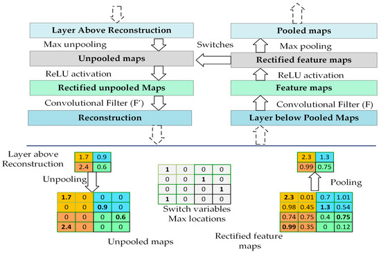 The top part illustrates the deconvnet layer on the left, attached to the convolutional layer on the right. The bottom part illustrates the pooling and unpooling operations [14].
