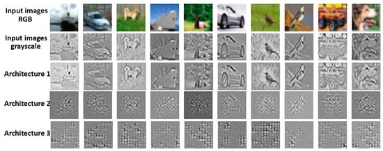 Visualization from the last convolutional layer for three different CNN architectures. Grayscale input images are visualized after preprocessing.
