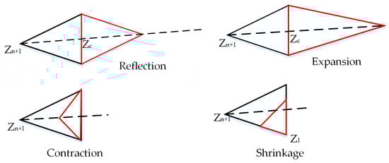 The search is performed based on four basic operations: reflection, expansion, contraction, and shrinkage, as shown in Figure 5. Each is associated with a scalar coefficient of α (reflection), β (expansion), γ (contraction), and δ (shrinkage). In each iteration, NMM tries to update a current simplex to generate a new simplex which decreases the value of the objective function. NMM replaces the worst vertex with the best that has been found from reflected, expanded or contracted vertices. Otherwise, all vertices of the simplex, except the best, will shrink around the best vertex. These processes are repeated until the stop criterion is accomplished. The vertex producing the lowest objective function value is the best solution that is returned. The main challenge in finding a high-performing CNN architecture is the execution time and, correspondingly, the number of computing resources required. We can apply our optimization objective function with any derivative-free algorithm such as genetic algorithms, particle swarm optimization, Bayesian optimization, and the Nelder-Mead method, etc. The reason for selecting NMM is that it is faster than other derivative-free optimization algorithms, because in each iteration, only a few vertices are evaluated. Further, NMM is easy to parallelize with a small number of workers to accelerate the execution time.