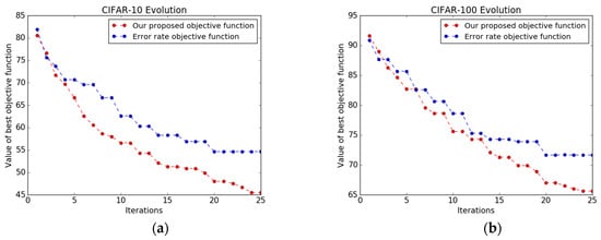 We further investigated the characteristics of the best CNN architectures obtained by both objective functions using NMM on CIFAR-10 and CIFAR-100. We took the average of the hyperparameters of the best CNN architectures. As shown in Figure 7a, CNN architectures based on the proposed framework tend to be deeper compared to architectures obtained by the error rate objective function alone. Moreover, some convolutional layers are not followed by pooling layers. As a result, we found that reducing the number of pooling layers shows a better visualization, and results in adding more layers. On the other hand, the architectures obtained by the error objective function alone result in every convolutional layer being followed by a pooling layer.