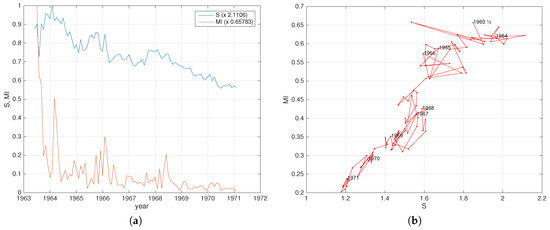 Analysis of the EZMU during the years 1963–1971 using the joint entropy S and mutual information I: (a) Time evolution of and ; (b) state space representation .