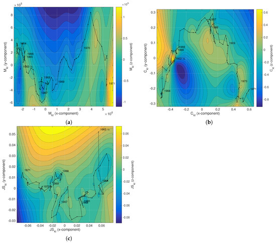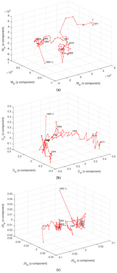 MDS charts with of the EZMU during the years 1963–1971 using the: (a) Manhattan distance, ; (b) Canberra distance, ; (c) Jensen–Shannon divergence, .