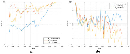 Analysis of the EZMU evolution during the years 1963–1971 using the Manhattan distance (), Canberra distance () and Jensen–Shannon divergence (). Comparison between: (a) two states at time and ; (b) two consecutive states at time t and .