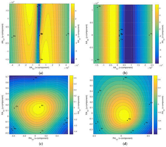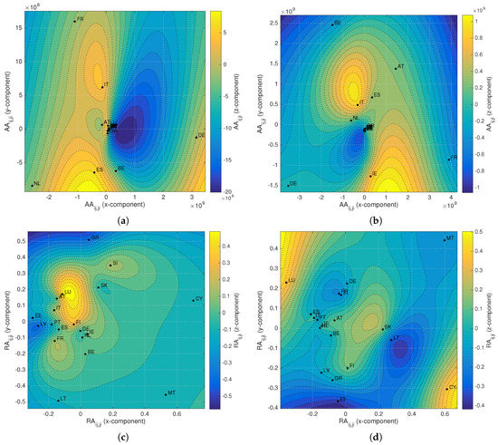 MDS charts with and RBI of the relationship between the EZMU countries in and using asymmetry measures. (a) , ; (b) , ; (c) , ; (d) , .