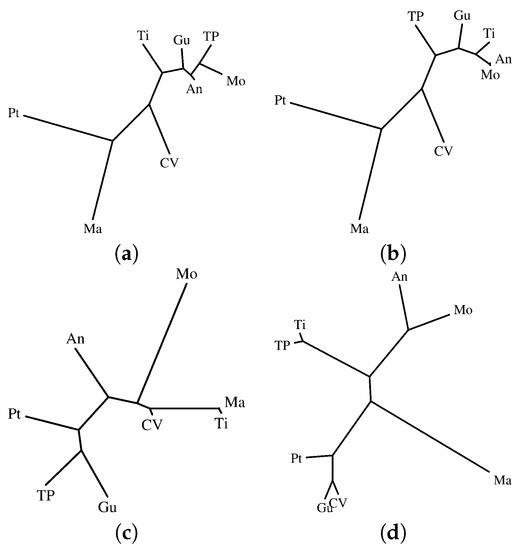 For the estimation of coordinates and map visualization, two computational techniques are adopted, namely, the MDS and the HC. Both methods seek to represent some kind of “map” in which items are represented by points positioned in some low-dimensional space, reflecting the relative distances measured in the original data. In the case of MDS, we adopt the so-called classical multidimensional scaling that takes the distance matrix G, , and returns a configuration matrix H, , with the coordinates of the n points in a q-dimensional space (). The algorithm also returns the eigenvalues of the scalar product matrix . The relative magnitudes of those eigenvalues provide information about the contribution of the corresponding columns of H in reproducing G with the reconstructed points. In some cases, the numerical values of the eigenvalues show that it is not possible to find a good low-dimensional reconstruction. In the case of HC, it is frequent to adopt dendograms or some kind of “tree” in a two-dimensional space, in which points are interconnected by the means of lines establishing a linkage between them. In the present paper for the HC, we will employ the Phylip package with the algorithms Neighbor and DrawTree [47].
