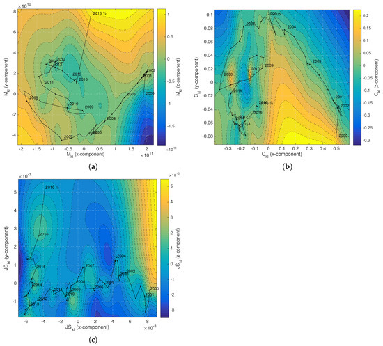 Analysis of the EMU evolution during the years 2000–2016 using the Manhattan distance (), Canberra distance () and Jensen–Shannon divergence (). Comparison between: (a) two states at time and ; (b) two consecutive states at time t and .