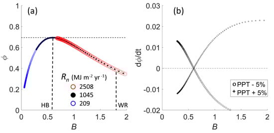 Remarkably, comparison of Figure 1a with Budyko’s [] depiction of biomes shows maximum biological diversity at B*, falling off abruptly either side. Since evolutionary change occurs by shifts in gene frequencies at the population level, among sets of individuals, spatially extensive water balance in basins exposes populations to ecohydrological entropy as a potential factor of natural selection, as it reflects the partitioning of input resources differentially into primary production that supports organisms, or otherwise, reduces resource availability. The asymmetry of ecological responses to fluctuations in rainfall either side of B* could drive plant species to diversify by specializing in the many modes of energy dissipation [], a process that began over 500 million years ago as plants colonized land. The preponderance of the contemporary land surface has higher aridity than optimum, which raises the sensitivity of entropy to fluctuations in rainfall (Figure 1b), of relevance to ongoing selection and species coexistence [,].