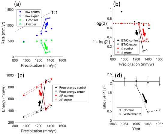 Water and energy components from Hubbard Brook experiment. (a) Water balance 1963–1968, with 3-year trajectories (solid arrows) of treatment Watershed 2 following removal of vegetation; (b) Ratios of evapotranspiration to flow, ET/Q, (black) and entropy (red), with theoretical maximum entropy, log(2) (upper dashed), and complement 1 − log(2) (lower dashed); (c) Energy components of controls, with excursions (solid arrows) by treatment watershed after vegetation removal (95% confidence interval of regression, dashed); (d) Ratio of energy components (mean of controls, horizontal line, +/−2 s.d.) and 4-fold reduction following vegetation removal (dashed, arrow).