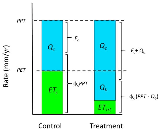 Similarly, vegetation removal flipped the partitioning of precipitation into dissipated energy,PPT, and free energy, PPT(1 − ), corresponding to a 4-fold drop in relative efficiency (Figure 2c,d). The discrete drop in entropy was due to conversion of some ET to flow in the amount Qb = PPT − ETc − Qc, where subscript c denotes control (Figure 3). We assumed that in control watersheds, ET was set by potential evapotranspiration, PET []. Entropy allowed ~60% of precipitation to be dissipated (Figure 2c; PPT = 97.25 + 0.595PPT, F[2,3] = 996, P < 0.0001). Removal of vegetation centered the free energy of Watershed 2 on this relation, while in reciprocal fashion, dissipated energy straddled the free energy relation of controls (Figure 2c). Thus, dissipated energy of the treatment watershed complemented the free energy of the controls and vice versa, thereby confirming an active role of vegetation in determining energetics of the system.
