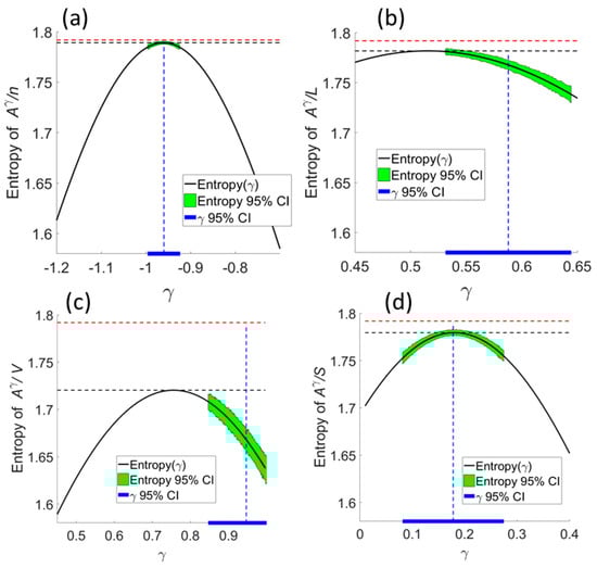 Total entropy summed across six Strahler orders for ratios of basin area, A, raised to exponent, γ. Variables were measured on 2537 streams occupied by vegetation, Whitewater River basin, Kansas. (a) Total number of vegetated streams, n; (b) Stream length, L; (c) Vegetated area, V; and (d) Richness of vegetation types, S. Blue bars are 95% confidence interval (CI) of null-model exponent, (blue dashed). Green is bootstrapped 95% CI of entropy of experimental ratios contingent on stream order, over the domain of the null-model CI. Horizontal dashed lines indicate peak entropy (black) and maximum unconstrained entropy (red). Intersection of black and blue dashed lines within green envelope supports the null hypothesis that entropy is equal between null and experimental formulations.