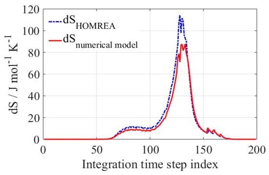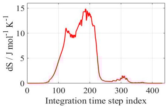 The same procedure as for analysis in H2/O2 mixtures was carried out for methane/air combustion system described by the polygeneration mechanism (PolyMech) []. The numerical entropy production using the PolyMech was calculated using Equation (4). The entropy produced by the system is displayed over the integration time step index for a CH4/Air mixture in Figure 4.
