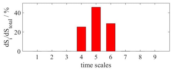 Figure 2 shows the time-integrated relative entropy production of the 9 timescales presented in the H2 mechanism of Warnatz. A notable difference in the values calculated were observed. As mentioned before, a tolerance value of 1% (δ = 0.01) was employed for computations using Equation (6). Since the difference between the relative entropy production values of each timescale is so pronounced, no tolerance variation analysis was performed. The results show that up to 99% of the system’s produced entropy is located within a relatively small group of eigenvalues (λ4–λ6), while the rest of them shown no contribution. The position of the timescales enables the identification of three groups of chemical reaction modes: dormant (λ1–λ3), relatively slow (λ4–λ6) and fast (λ7–λ9). The fast modes describe quickly relaxed processes, which in most of the cases remain stationary or quasi-stationary; the dormant ones are those that can be considered as quasi-conserved; and the relatively slow group of eigenvalues represent the processes that completely govern the progress of chemical reactions and are able to describe the dynamics of the corresponding system [].