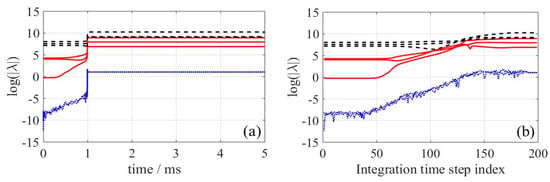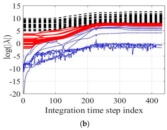 In Figure 3, the logarithm of the system-eigenvalues in absolute values is depicted over the simulation time on the left (Figure 3a) and over the integration time step index on the right (Figure 3b). Time step index was preferred over the real simulation time since a better visualization of the system’s internal structure during reaction is possible. Changes of this function are considerable close to the ignition delay time, but almost negligible at the first milliseconds of reaction and near the equilibrium. As important events in combustion processes take place in a very short period of time, details will only be visible using integration time step index instead of the real simulation time as can be seen in Figure 3a,b. The number of modes (i.e., characteristic timescales) located in each group of sub-processes depicted in Figure 3 remains constant along the integration time. Namely, only three modes remain “active” and drive the system towards the equilibrium.