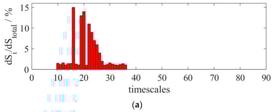 Local characteristic timescales obtained from the Jacobian-matrix eigenvalues (3) were calculated and sorted in ascending order by their absolute values at each time step. Once the simulations were concluded, the obtained eigenvalues were plotted against the integration time index in order to observe their evolution over time and be able to separate them in different groups of sub-processes. The decomposition of system timescales is generally characterized by a so-called gap between the timescales, which allows their division in different groups of modes. This methodology was, however, impossible to perform since in typical large combustion systems no gap between the eigenvalues is observed. The absence of a clear separation brought difficulties concerning the characteristic timescales separation. To overcome this problem, the suggested concept of relative entropy production was implemented. This can be calculated using Equation (6) as the entropy production of each timescale over the entire simulation time divided by the total entropy produced in the system. Thus, the entropy of irreversible multi-scale processes (e.g., detailed kinetic models) can be used to study the sub-space decomposition of the system (see e.g., Valorani et al. []).
