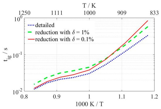 As can be seen in Figure 6, none of the two skeletal mechanism match perfectly the curve representing the detailed model, both being slower than the latter one. The reduced model with δ = 1% (dashed line) follows the same trend as the detailed model (dotted line). Meanwhile, the reduced version with δ = 0.1% (straight line) lies significantly closer to the detailed mechanism at high temperatures and gradually moves away as the temperature decreases locating at higher values of IDT at temperatures below 930 K, the point at which the curves of both skeletal mechanisms intersect. IDTs of the model with the higher tolerance are, in average, by a factor 1.49 slower than the ones calculated with the detailed version of the PolyMech, while values obtained with the lower tolerance reduced model are, in average, in slightly better agreement with a factor of 1.42 with respect to the latter one.