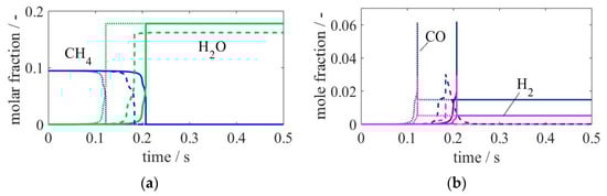 Mole fraction comparison of CH4, H2O (a) and CO, H2 (b) over time for stoichiometric CH4/Air mixtures using the detailed reaction mechanism (dotted lines), the reduction with δ = 1% (dashed lines) and δ = 0.1% (straight lines) at p = 15 bar and T = 900 K.