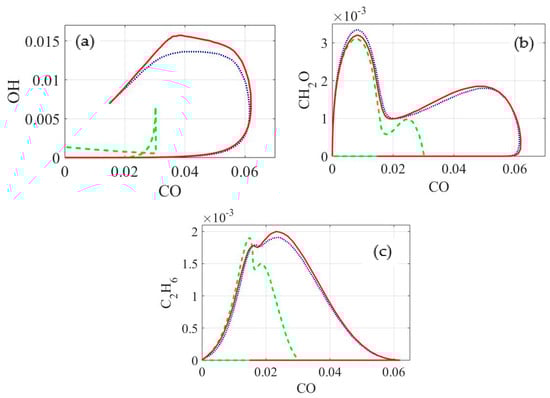 Comparison of species profiles for stoichiometric CH4/Air mixtures using the detailed reaction mechanism (dotted lines), the reduction with δ = 1% (dashed lines) and δ = 0.1% (straight lines) at p = 15 bar and T = 900 K. (a) Hydroxide radical (b) Formaldehyde and (c) Ethane.