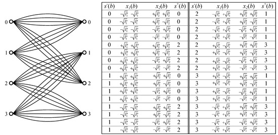 The trellis section of (CcBPSK, UnBPSK) with 32 branches. For each branch b, and are the left state and the right state, respectively; while the associated symbols and are the transmitted signals at Sender 1 and Sender 2, respectively.
