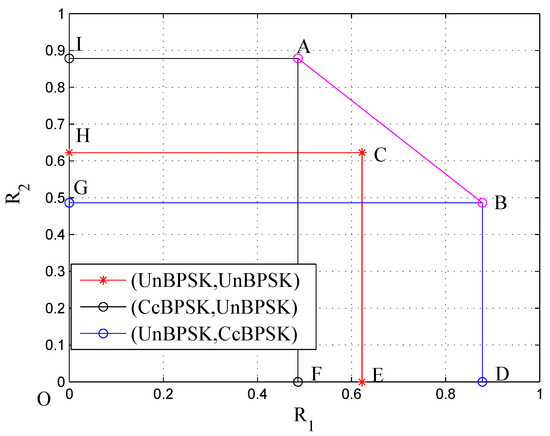 The evaluated achievable rate pairs of a specific Gaussian interference channel (GIFC), where and . The rectangle OECH with legend “(UnBPSK, UnBPSK)” corresponds to the case when both senders use UnBPSK as inputs; the rectangle ODBG with legend “(UnBPSK, CcBPSK)” corresponds to the case when Sender 1 uses UnBPSK as input and Sender 2 uses CcBPSK as input; and the rectangle OFAI with legend “(CcBPSK, UnBPSK)” corresponds to the case when Sender 1 uses CcBPSK as input and Sender 2 uses UnBPSK as input.