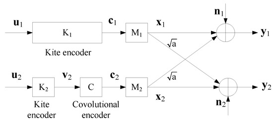 We design a coding scheme using Kite codes (The main reason that we choose Kite codes is that it is convenient to set up the code rates. Actually, given data length, the code rates of Kite codes can be “continuously” varying from to with satisfactory performance, as shown in [31,32].). Kite codes are a class of low-density parity-check (LDPC) codes, which can be decoded using the sum-product algorithm (SPA) [33,34]. As shown in Figure 5, Sender 1 uses a Kite code (with a parity-check matrix ) and Sender 2 uses a Kite code (with a parity-check matrix ) concatenated with the convolutional code with the generator matrix