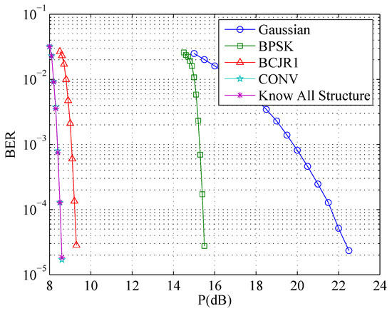 In this subsection, simulation results of the decoding algorithms are shown and analyzed. Simulation parameters of Figure 8 and Figure 9 are presented in Table 1. In these two figures, we let the power constraints of two senders be same, that is, . Here, “Gaussian" stands for the scheme “knowing only the power of the interference”, “BPSK” stands for the scheme “knowing the signaling of the interference”, “BCJR1” stands for the scheme “BCJR-once”, “CONV” stands for the scheme “BCJR-repeat” and “Know All Structure” stands for the scheme “knowing the whole structure”. Figure 8 shows the error performance of Receiver 1. From Figure 8, we can see that, for Receiver 1, more details of the structure of the interference are known, better performance is obtained, that is, the decoding gains get larger. Similarly, Figure 9 gives the error performance of Receiver 2, where the scheme “knowing the whole structure” still has the best performance and the decoding gain can be achieved by taking into account the structure of the interference.