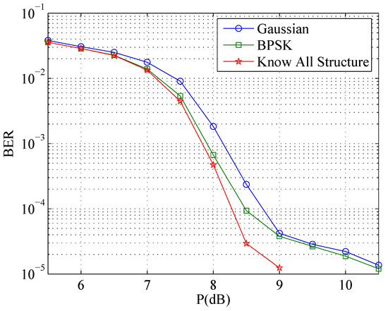 The error performance of Receiver 2. “Gaussian” stands for the scheme “knowing only the power of the interference”, “BPSK” stands for the scheme “knowing the signaling of the interference” and “Know All Structure” stands for the scheme “knowing the whole structure”.