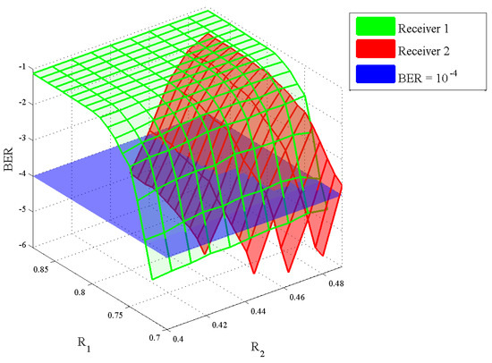 Error performance of two users with different code rate pairs . Blue plane represents BER level, green surface stands for the error performance of Receiver 1 and red surface stands for the error performance of Receiver 2.