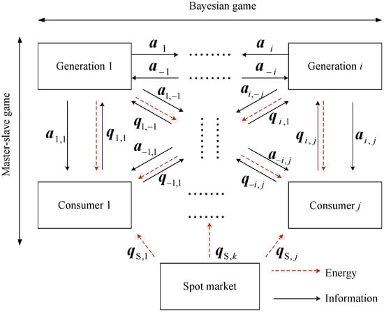 This paper focuses on the bilateral contract transaction with multiple generation companies and large consumers. Suppose that there are H time slots in a bilateral contract transaction. The transaction contains I generation companies and J large consumers. Assume that the bidding price of company i is for consumer j [], where is initial price and is a growth factor about contract quantity of electricity. That is, when consumer j signs contract quantity from company i in time slot , the bidding price is . After getting the bidding price, large consumers decide the contract quantities with different companies. Note that in the paper is constant for company i, and the decision variable is only . The decision relationship for the master–slave game among multiple generation companies and large consumers is shown in Figure 1. In the figure, represents generation company i’s bidding price set for all large consumers, represents other companies’ bidding price except company i, represents other companies’ bidding price for large consumer j except company i, and represents the bidding price of company i for all large consumers except consumer j. represents contract quantity purchased by large consumer j from company i in H time slots, and represents energy quantity purchased by large consumer j in spot market in H time slots.