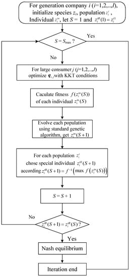 After knowing the optimal purchase strategies of all large consumers, the master–slave game degenerates into a Bayesian game. Bayesian Nash equilibrium can be searched with a co-evolution algorithm [,,]. The mapping relation between a co-evolution algorithm and a Bayesian game can be founded as: Nash equilibrium → ecosystem; players → species; strategy set → population; strategies → individuals. Based on the above mapping relation, the process for searching Bayesian Nash equilibrium is shown as follows: