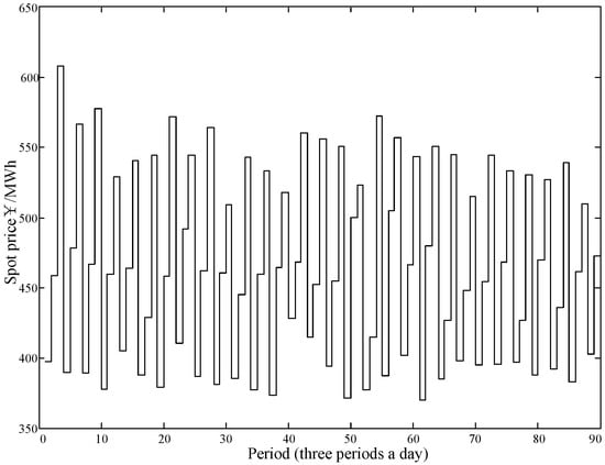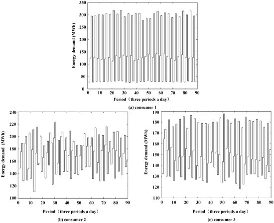 In the simulation, assume that there are three generation companies and three large consumers. These large consumers need to make a bilateral contract transaction with generation companies for a month. Based on off-peak loads, mid-peak loads, and on-peak loads in a whole day, the classification of daily time spans is shown in Table 1 []. The price in the spot market generally varies with the load level, which has high value in peak hours and low value in off-peak hours. Since the load can be predicted based on the historical data, we assume that the spot price in a month has been predicted, which is shown in Figure 3. For simplicity, we have divided a month into 90 time slots. Corresponding to the 90 time slots, we assume that three large consumers have forecasted their energy demand in these time slots, which is shown in Figure 4. All of the above-referred price is made up according to the current situation of China’s electricity industry, and the energy demand of large consumers is based on the electricity consumption of the chlor-alkali industry and the electrolytic aluminum industry. Since the generation cost of a company is a trade secret, we assume that each generation company only knows their own generation cost but do not know their opponents’ cost. In the case study, suppose that each company has a type space with three types according to generation cost. Coefficients of generation cost A and B are different with each type. Although generation cost is not public information, the probability of each type in the combination is known to other companies. Here, we assume that the probability of type 1 and 2 for any company is equal to 0.3, and the probability of type 3 is equal to 0.4. Consequently, the joint probability distribution of all communities with any type combination can be deduced. For example, when the types of three companies are type 2, type 1, and type 3, then the joint probability distribution for such a type combination is . Other parameters related to the simulation are shown in Table 2. The parameters in the co-evolution algorithm are set as follows: the evolution of each population is based on the standard genetic algorithm; each population contains 50 individuals; crossover probability is 0.90 and mutation probability is 0.05; maximum number of evolution = 180.